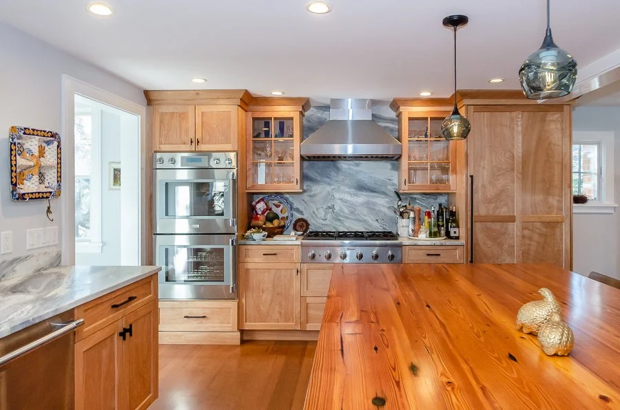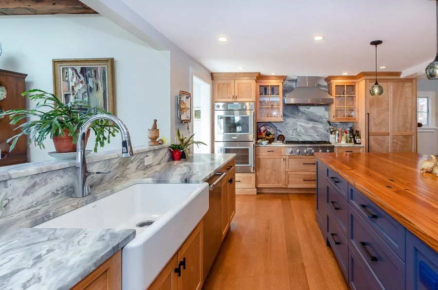 We began the design process by trying to minimize the impact to the saltbox facade by introducing a flat roof addition to the back of the house. The flat roof elements allowed us to keep the existing second floor bedroom windows, while increasing the kitchen and living room space on the first floor.